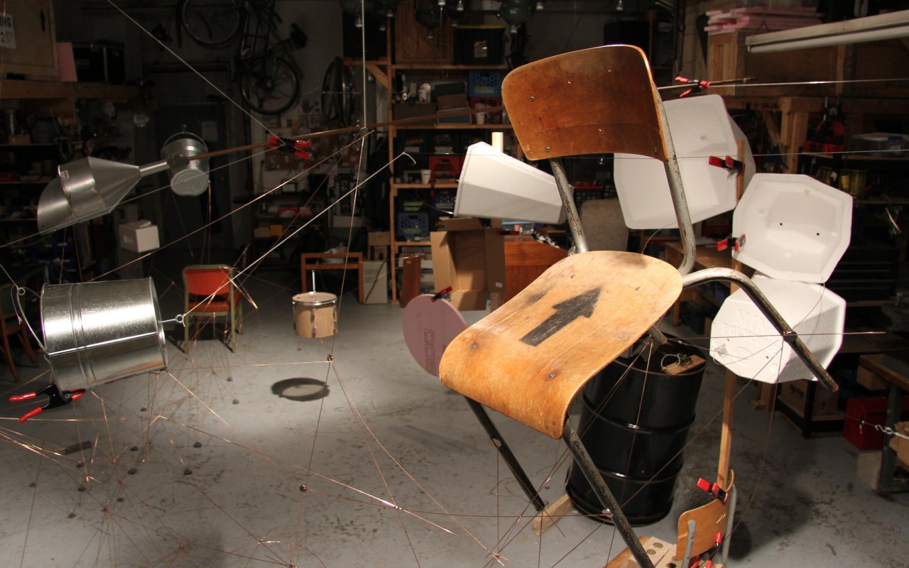 The resulting installation is a large network of metal rods interconnected by strong rare earth magnets. Found metal elements in the gallery such as water pipes, light fixtures, nails hidden under layers of paint, and window frames, are used as anchor points for the structure, and in one case as an armature for one of several copper wire coils. These coils draw electricity from a single wall outlet, harnessing the alternating current in order to oscillate the assembly. Lines and Coils playfully imagines the idea of electromagnetic activity as physical lines in space, embodied in a temporary structure that can be entered and experienced.
